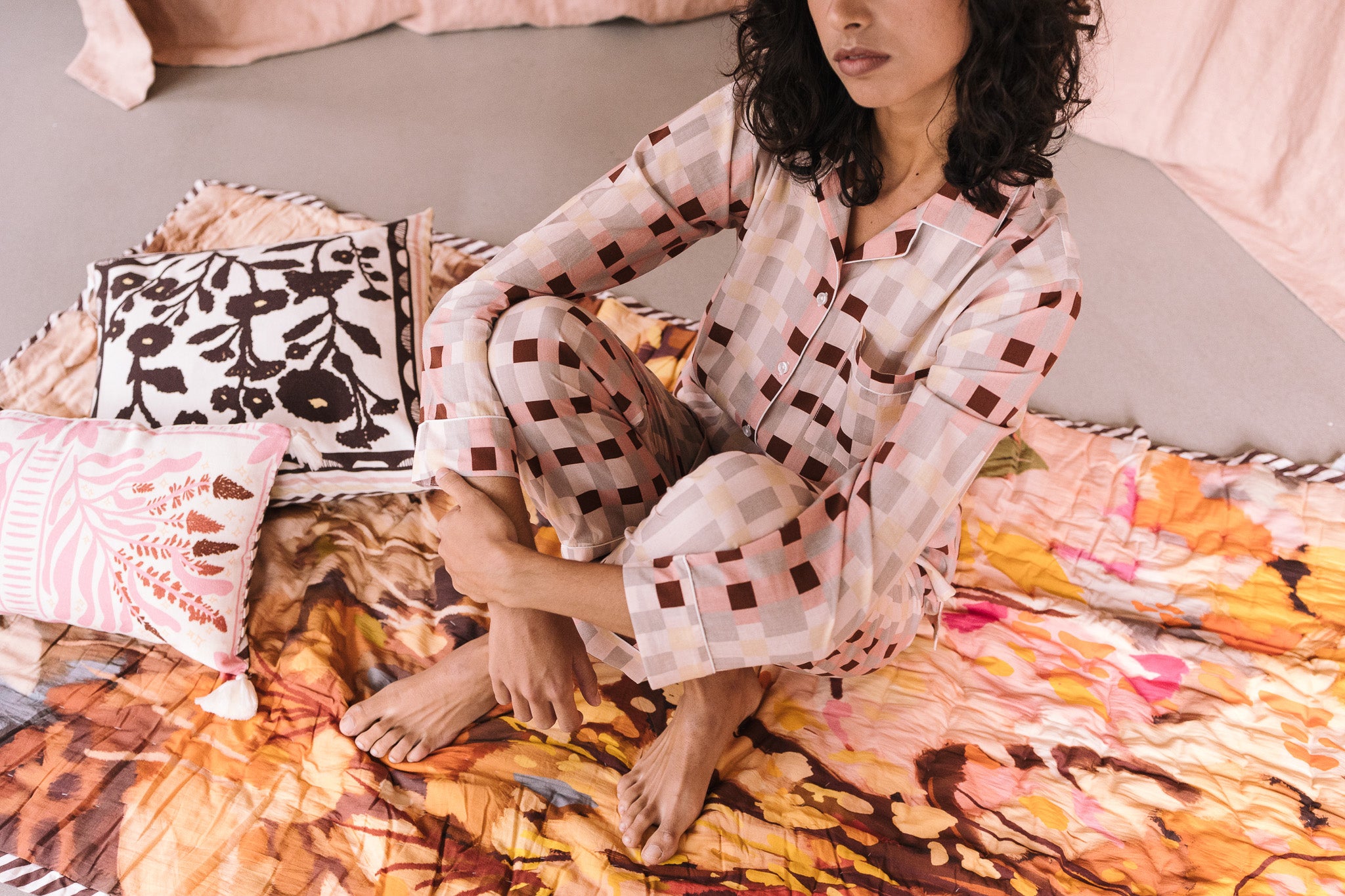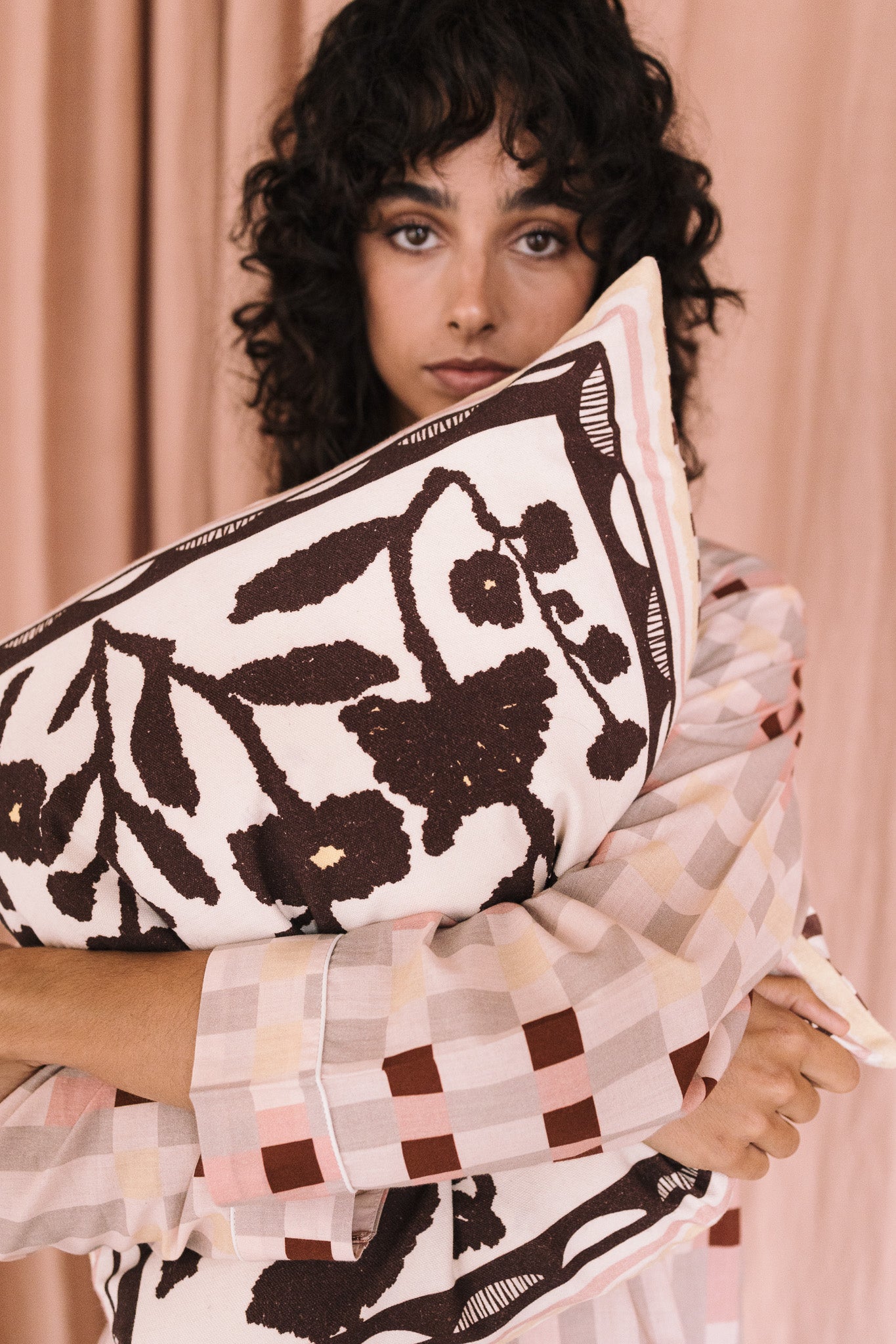 Cojín 100% algodón Duck, tejido cuidadosamente seleccionado y con estampado realizado a mano. Perteneciente a la Colección "Autumn-Winter 25"