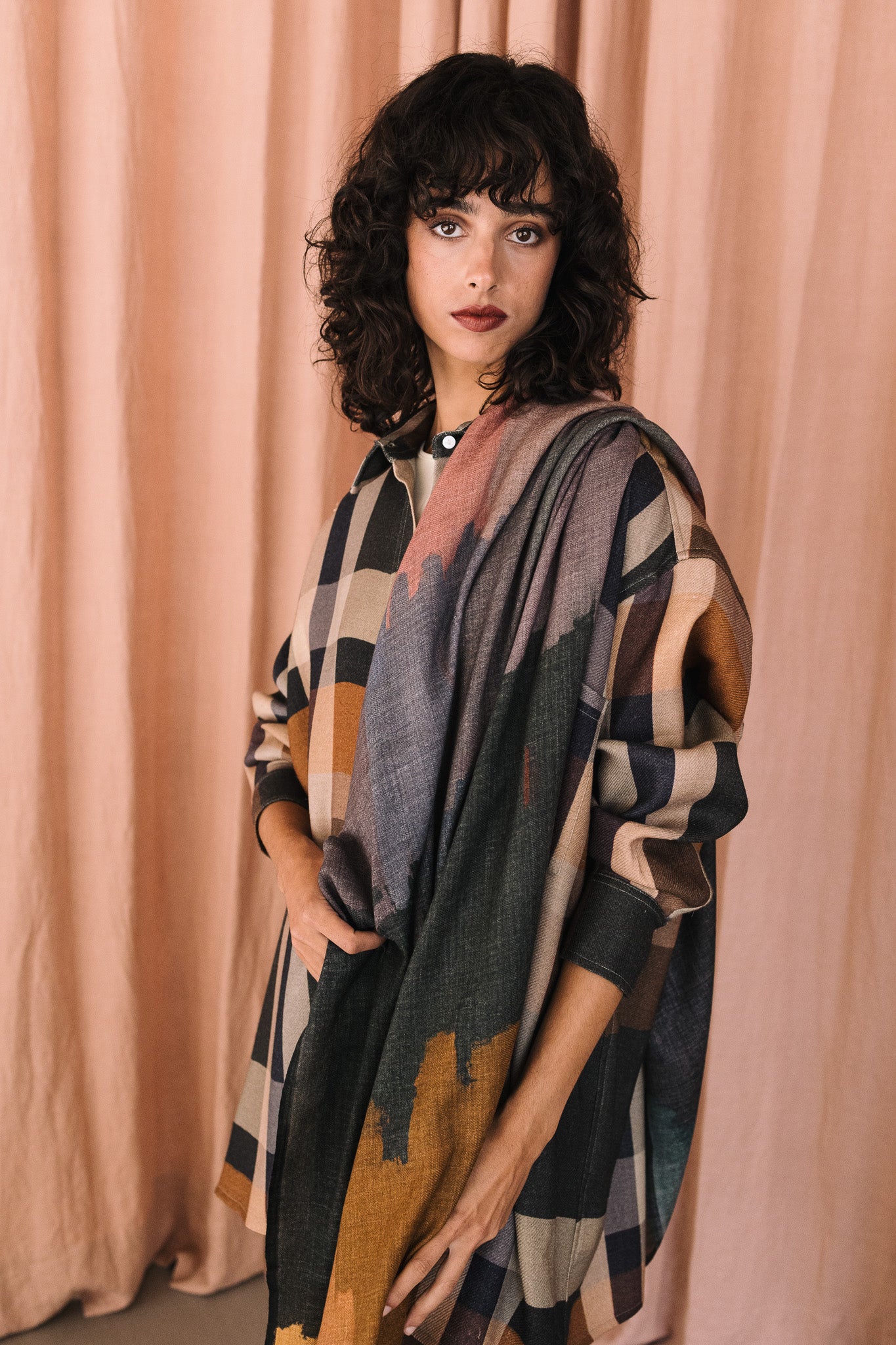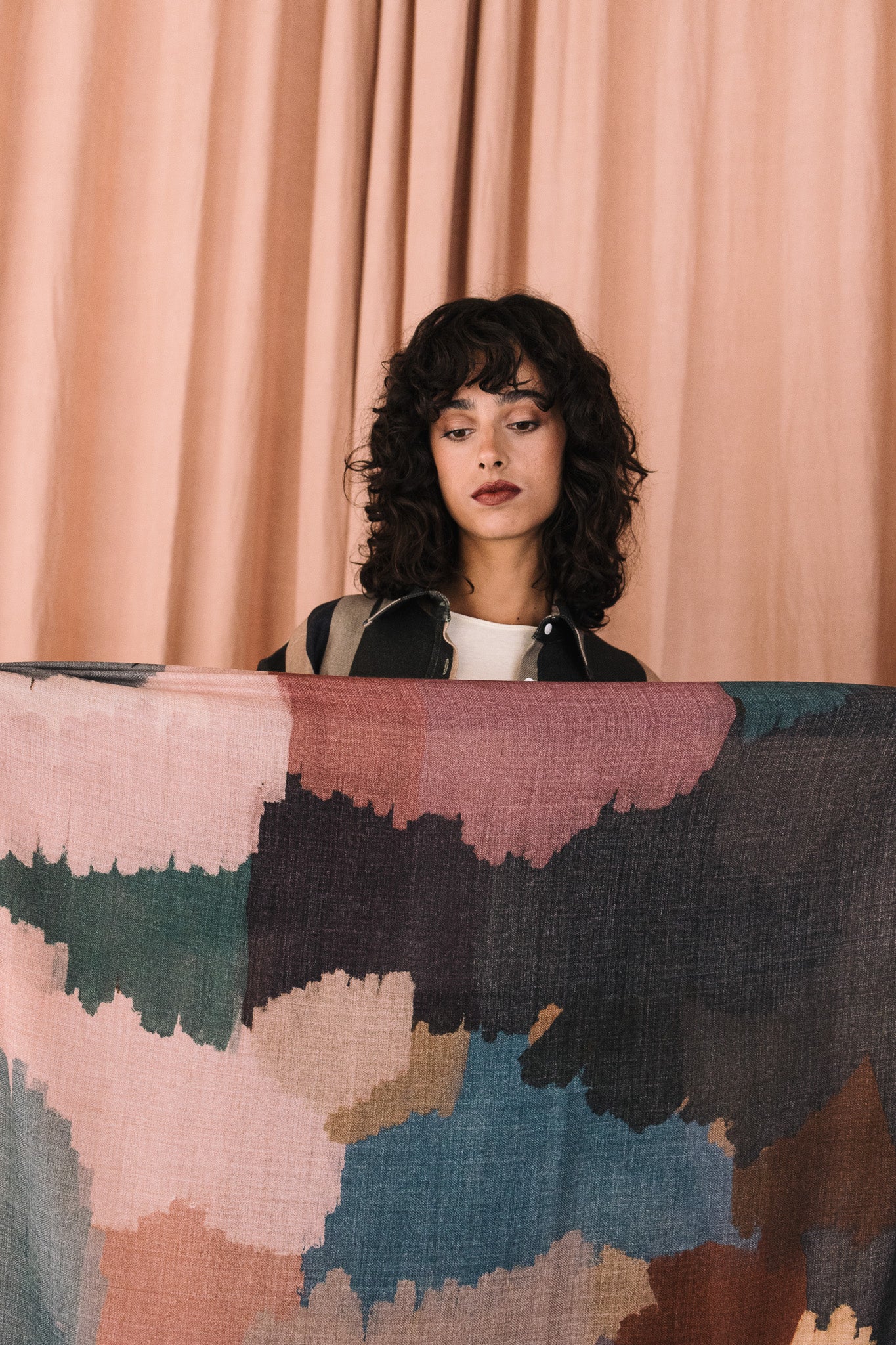 Pañuelo 100% lana, tejido cuidadosamente seleccionado y con estampado realizado a mano. Perteneciente a la Colección "Autumn-Winter 25"